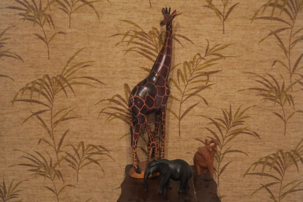 Un sujet "girafe et son girafon" en bois sculpté polychrome (accidents) deux éléphants en bois sculpté