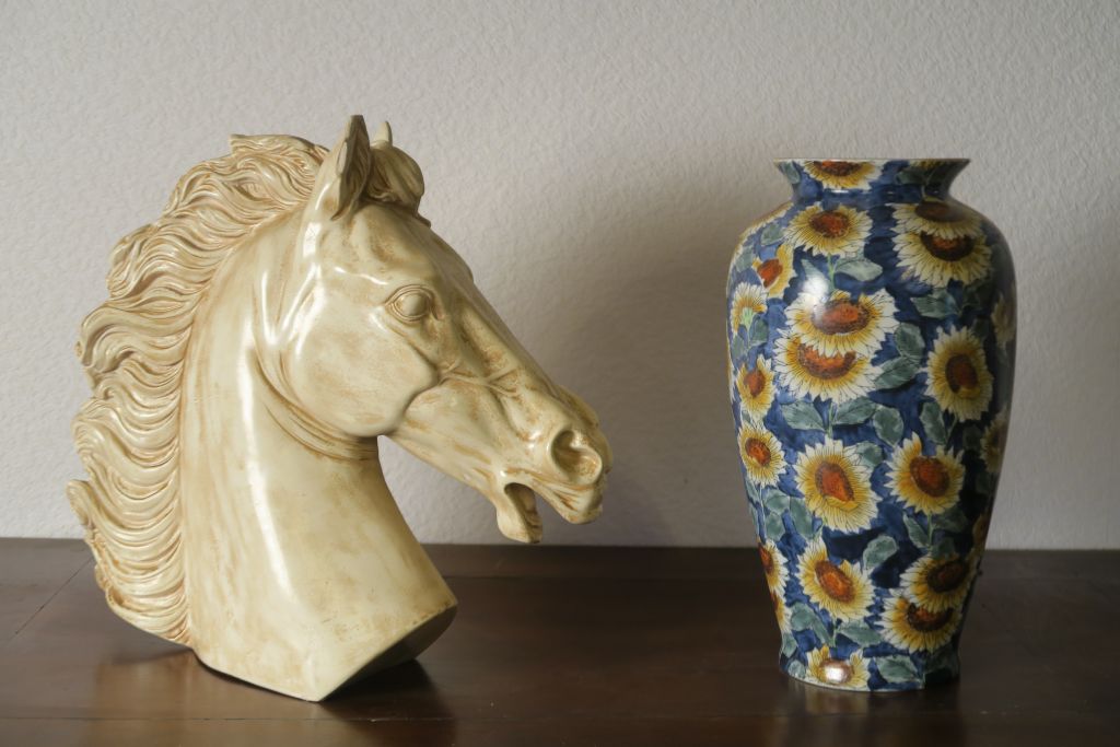 Vase en porcelaine à décor de fleurs de tournesol. H. 37 cm. Ecole française XXème. "tête de cheval". Sculpture en plâtre. H. 39 cm.