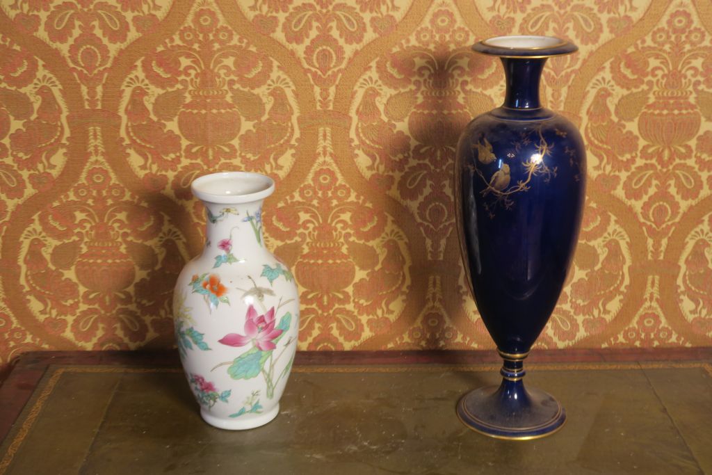 Vase en porcelaine de Chine. H. 36 cm. Vase se en porcelaine de Sèvres à décor d'oiseaux branchés dorés sur fond bleu nuit. H. 55,5