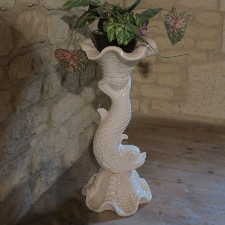 Vasque en barbotine blanche en forme de dauphin H. 70 cm