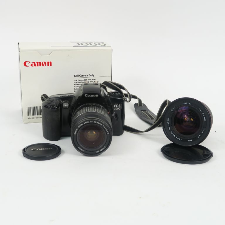 CANON EOS 3000 avec objectif CANON EF 28-80 mm 1 : 3.5-5.6 II diam. : 58 mm avec boite d'origine et mode d'emploi. On y joint un objectif COSINA 19 - 35 mm 1 : 3. - 4.5 diam. : 77 mm