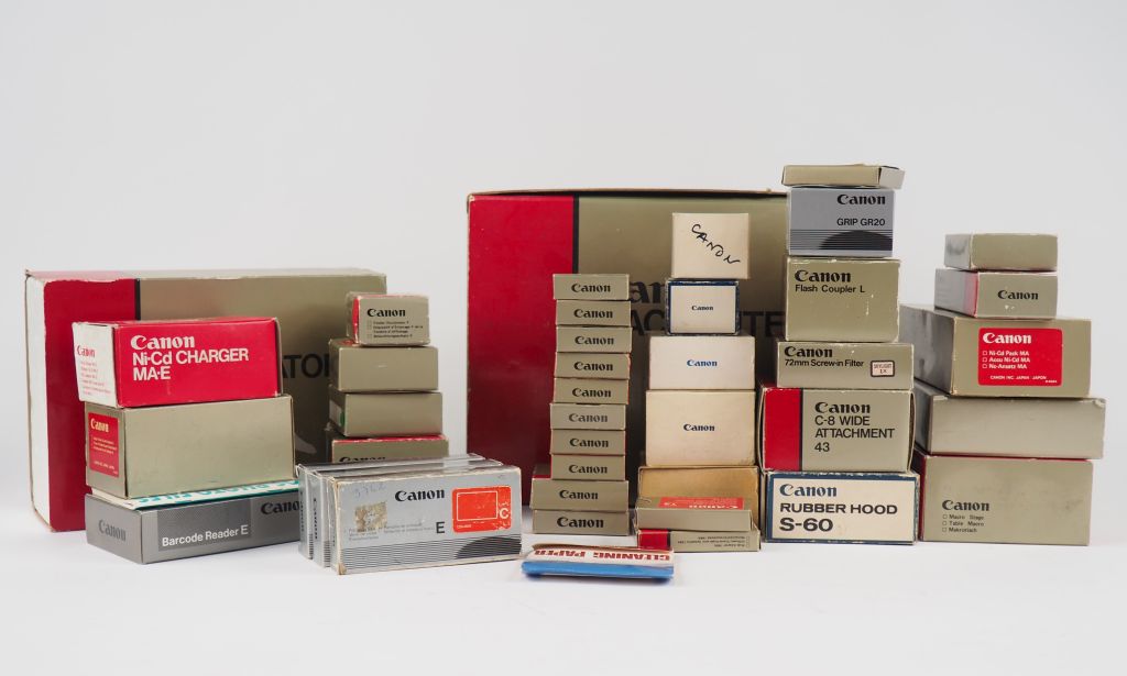 CANON. Important lot d'accessoires pour appareils photographiques, la plupart dans leurs boites d'origines.