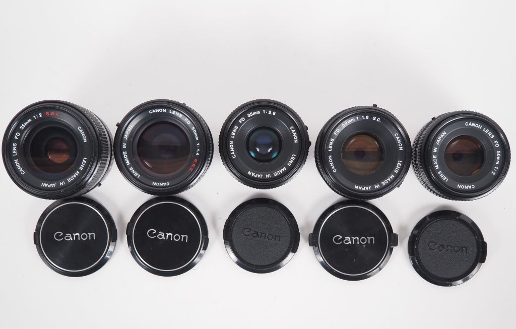 CANON. Lot de cinq objectifs : - FD 1:2.8/35 n°87823 - FD 1:2.8/50 n°106153 - FD 1:1.4/50 n°751004 (rayure) - FD 1:2/35 n°73378(rayure) - FD 1:1.8/50 n°830030