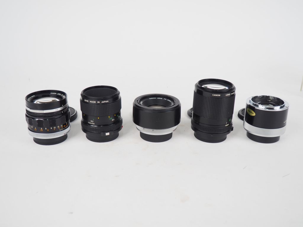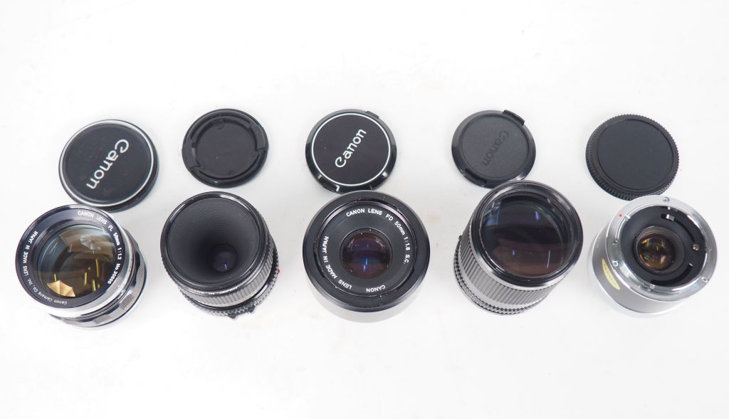 CANON. Lot de quatre objectifs : - FD 1:3.5/50 n°152459 - FD 1:1.8/50 n°1507529 avec pare soleil BS-55 - FL 1:1.2/58 n°30986 - FD 1:2/100 n°19397 On y joint un CANON EXTENDER FD n°44139