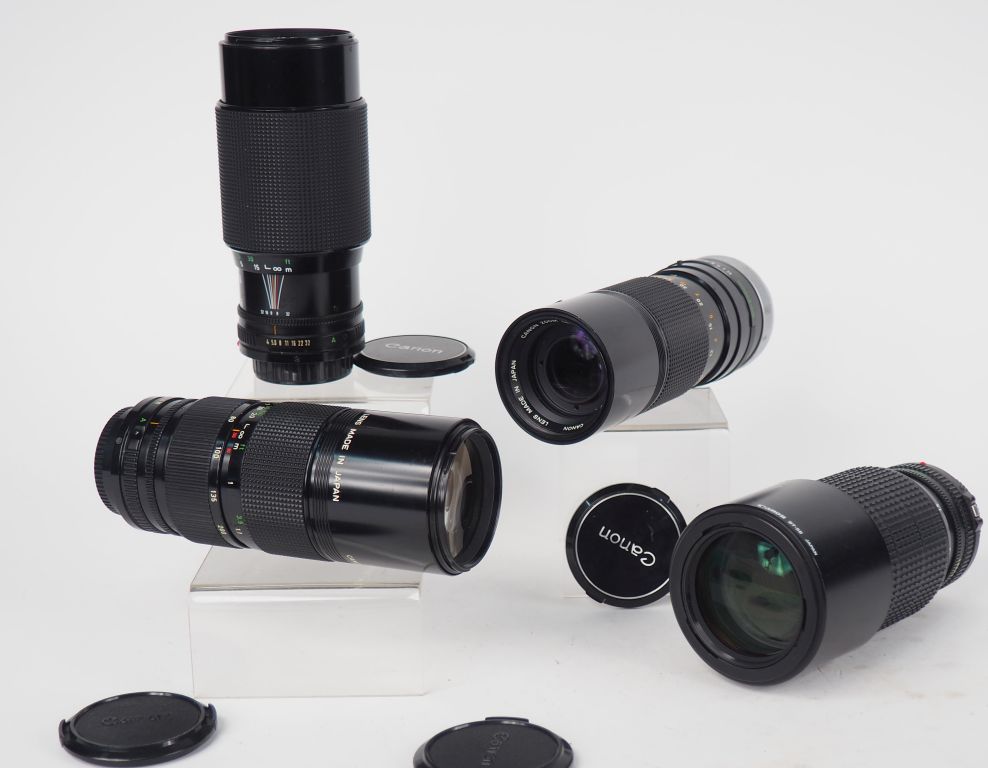 CANON. Lot de quatre objectifs : - ZOOM FD 1:4/80-200 n°20681 avec pare soleil BT-85 - ZOOM FD 1:4/70-210 n°342053 - ZOOM FD 1:4/80-200 n°26818 - ZOOM FD 1:5.6/100-200 n°197319