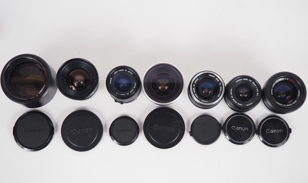 CANON. Lot de sept objectifs : - FD 1:4/17 n°23552 - FD 1:2.8/28 n°215590 - FD 1:2.8/24 n°24686 - FD 1:2/28 n°15596 avec pare soleil BW-55-A - FD 1:2/24 n°18270 - FD 1:2.8/20 n°12994 avec filtre CANON SKYLIGHT - FD 1:1.2/85 n°34014 avec pare soleil BT-72