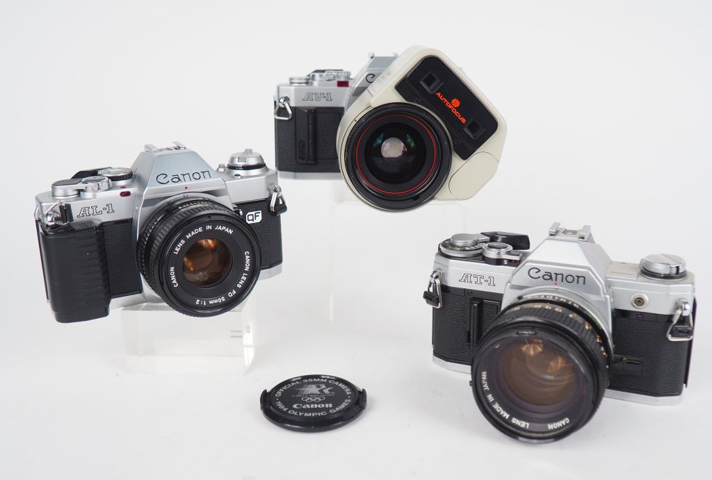 CANON. Lot de trois appareils photographiques : - AL-1 QF n°1195945 avec objectif CANON FD 1:2/50 - AT-1 n°280859 avec objectif CANON FD 1:1.4/50 avec filtre UV - AV-1144476 avec objectif CANON AUTOFOCUS 1:4/35-70 n°18459