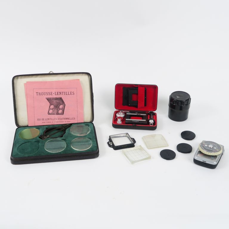 Cellule Toshiba Linear + coffret ROLLEIKIN + coffret ‘Trousse Lentilles’ (manque une lentille) + boite pour objectif + 3 éléments de visée + caches objectifs.