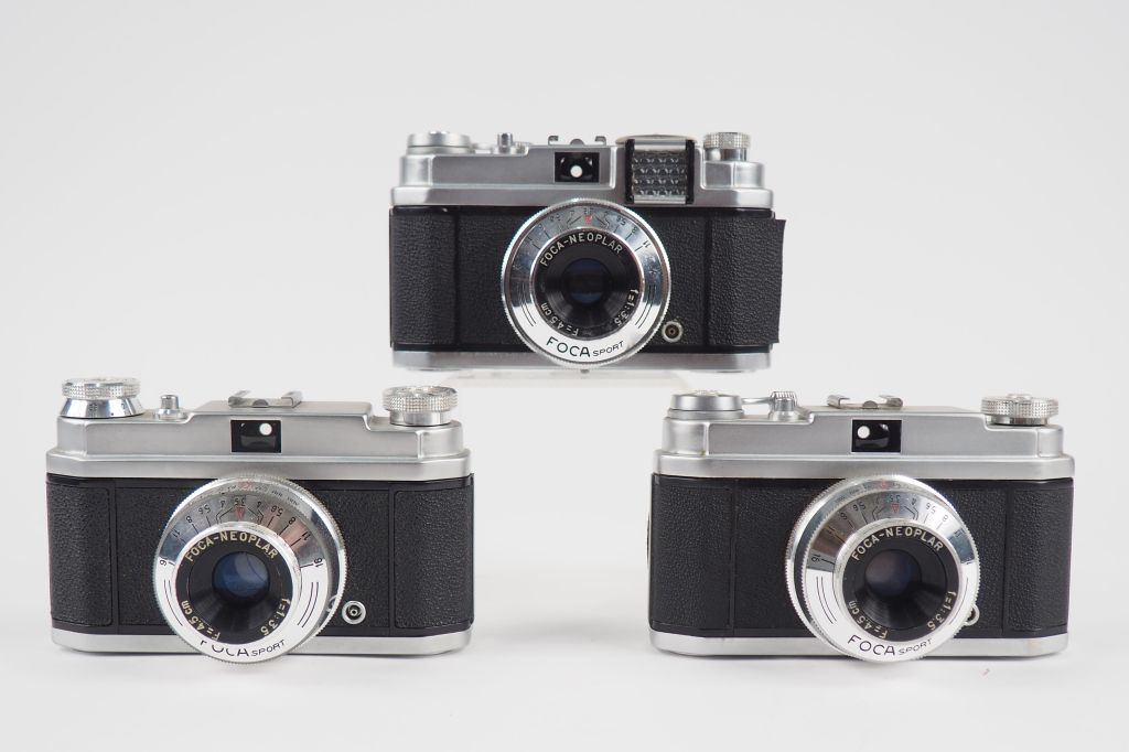 FOCA. Lot de trois appareils photographiques FOCASPORT (n°025.488 S/705.250/612.069) avec objectifs NEOPLAR 1:3.5/45.