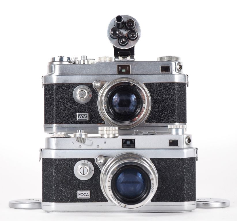 FOCA UNIVERSEL. Lot de deux appareils photographiques : - n°13.641M avec objectif OPLAREX 1:1.9/50 n°131590 et viseur universel - n°171.59 avec OPLAREX 1:1.9/50 n°131451
