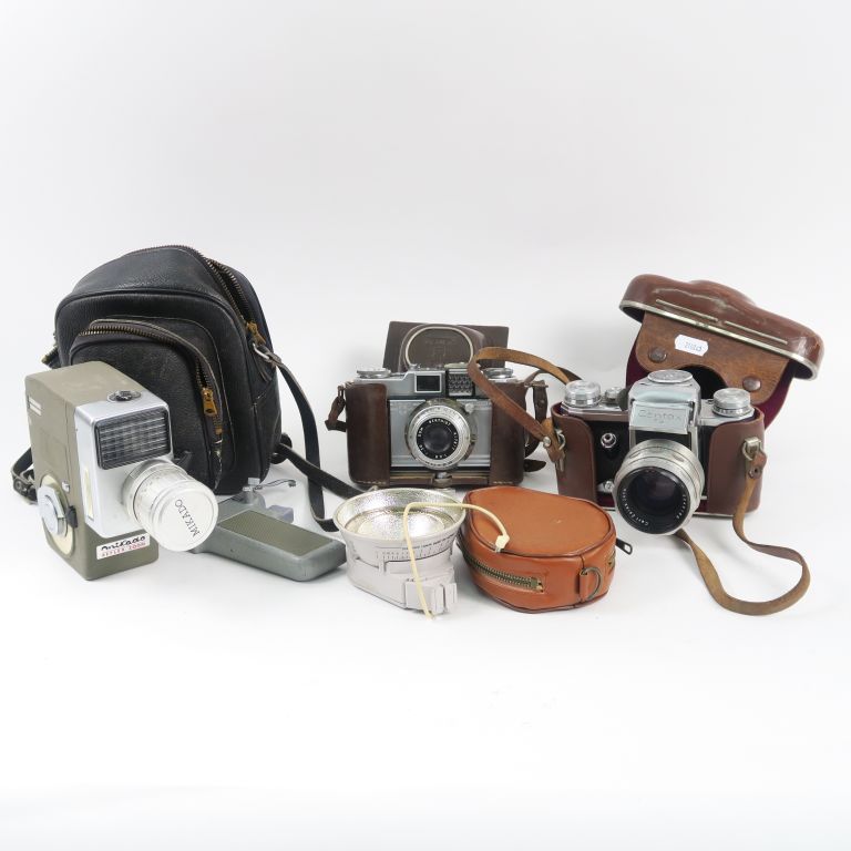 Lot comprenant : MIKADO 8 ROYER SAVOY objectif BERTHIOT 1 : 2.8 f=50 CONTAX FB objectif CARL ZEISS JENA (enfoncement) FLASH MONI FLASH