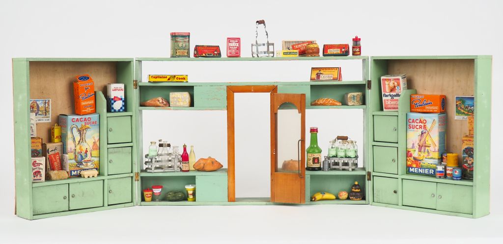 Lot de 2 épiceries anciennes garnies avec ses accessoires des années circa 1920 et 1950.