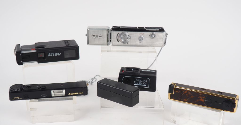 Lot de cinq appareils photographiques miniatures : - MINIMAX LITE - ACMEL MX - REVUE MINI-STAR avec flash - CIPC PF MICRO 110 - KIEV 303