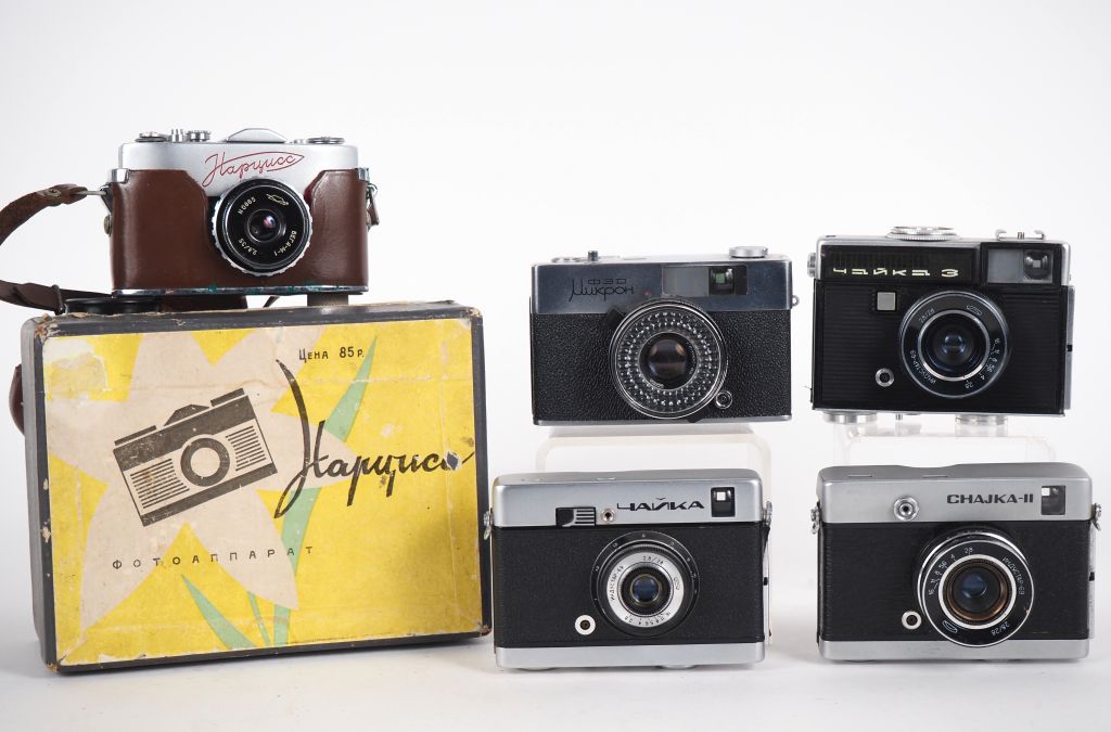 Lot de cinq appareils photographiques russes, dont un dans sa boite d'origine.