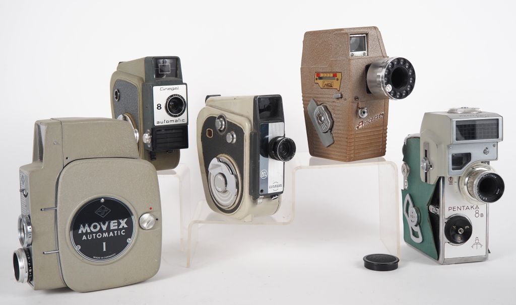 Lot de cinq caméras 8mm : - CINERIC PRINCESSE - CINEGEL COMETE n°3480 - PENTAFOT PENTAKA 8 B - AGFA MOVEX AUTOMATIC I n°CE7078 - CINEGEK COMETE n°624