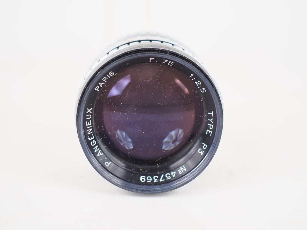Lot de quatre objectifs pour caméra : - ANGENIEUX type P3 F=75 mm/1:2,5 n° 457369 - SOM BERTHIOT CINOR F=10mm/1:1,9 n° US5822 - SOM BERTHIOT CINOR F=20 mm/1:1,9 n° R39235 dans sa boite - SOM BERTHIOT CINOR F=25mm/1:1,4 n° VA0669 on y joint deux montures d'objectifs JHAGEE