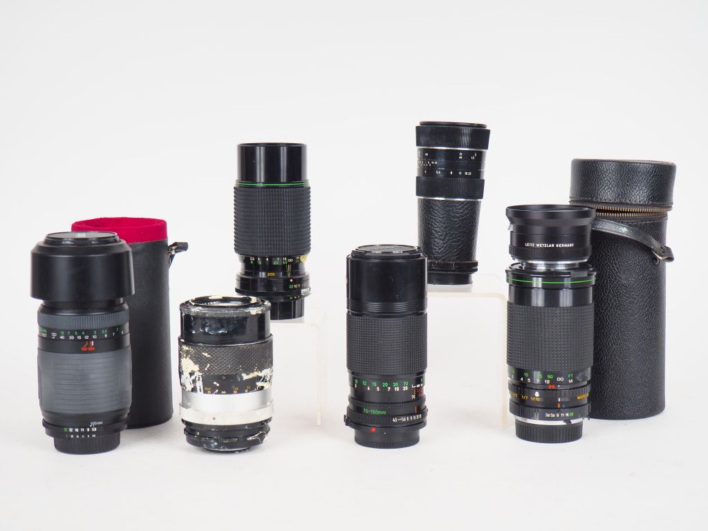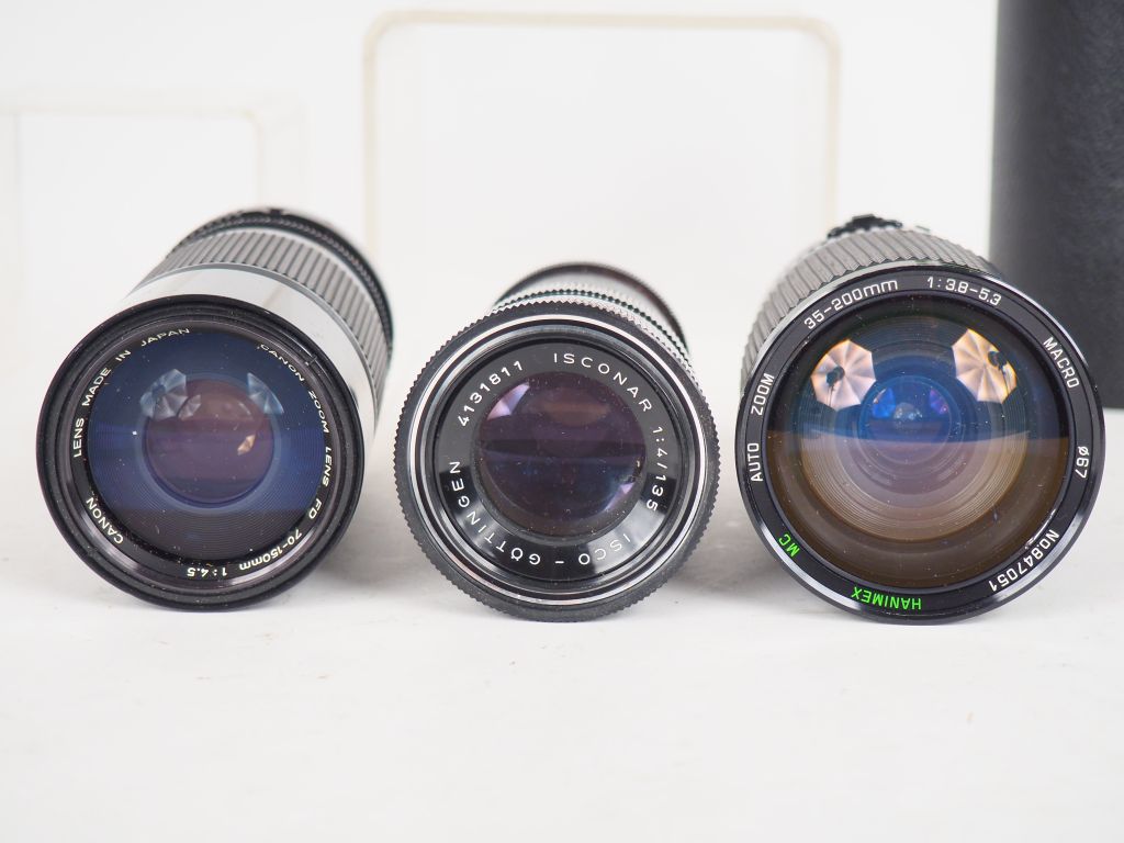 Lot de six objectifs différents (état d'usage) dont HANIMEX, VIVITAR, CANON, ISCO, NIKKOR