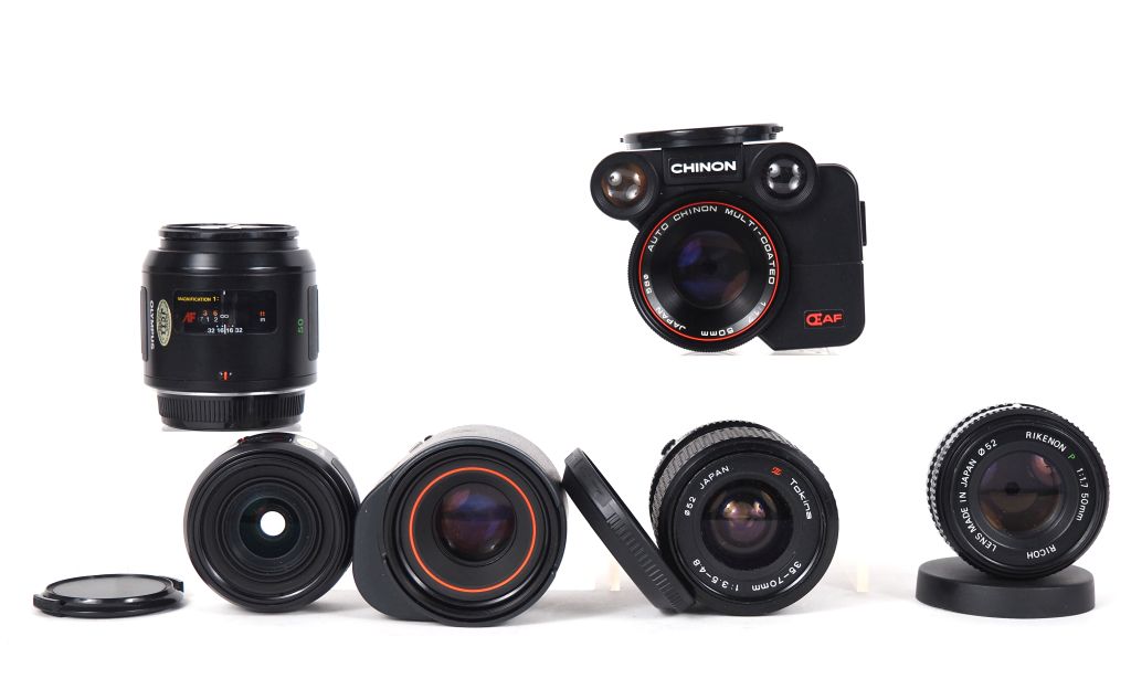 Lot de six objectifs : - TOKINA 1:3.5-4.8/35-70 O/OM n°7403109 - OLYMPUS AF 1:2.8/24 n°506432 - OLYMPUS AF MACRO 1:2.8/50 n°102533 - RICOH RIKENON 1:1.7/50 - CANON AC 1:1.8/50 n°43929 - CHINON AF 1:1.7/50 n°606422