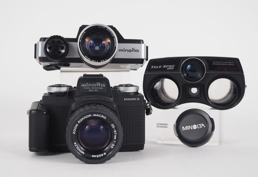 Lot de trois appareils photographiques : - MINOLTA 110 ZOOM SLR avec objectif ROKKOR-MACRO 1:4.5/25-50 - MINOLTA 110 ZOOM SLR MARK II avec objectif ROKKOR-MACRO 1:3.5/25-67 - TELE-SPOT 110