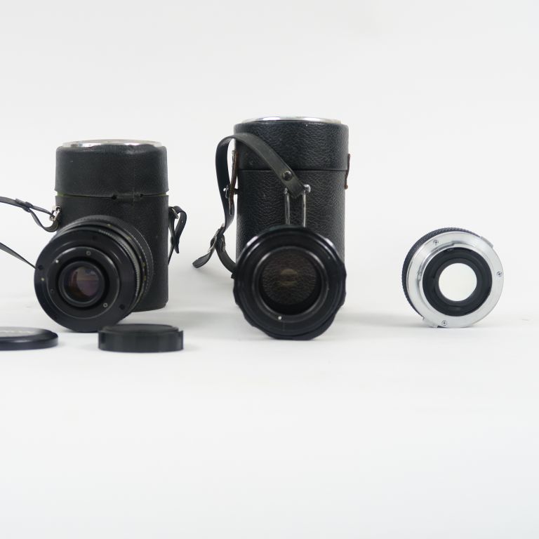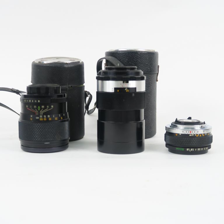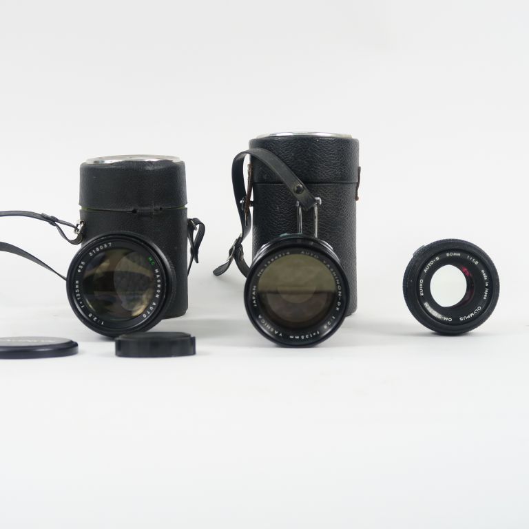 Lot de trois objectifs, montures différentes : Objectif OLYMPUS OM-SYSTEM ZUIKO AUTO-S 1:1.8 n° 3578604 50 mm Objectif YASHICA YASHINON-DX 1:2.8 f=135 mm n°1384314 avec house Objectif MAGNON 1 :2.8 f=135 mm n°318037 diam. : 55 mm avec housse