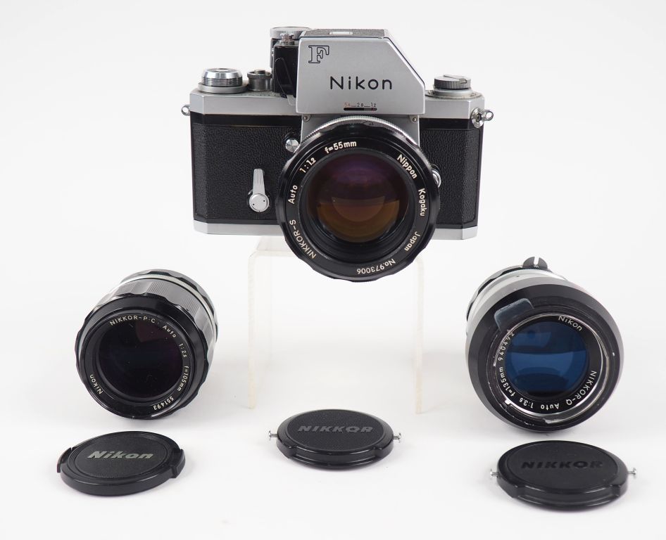 NIKON F. Appareil photographique n°6884754 avec trois objectifs : - NIKKOR-S 1:1.2/55 n°973006 - NIKKOR-Q 1:3.5/135 n°940492 avec pare soleil HS-9 - NIKKOR-P 1:2.5/105 n°551493