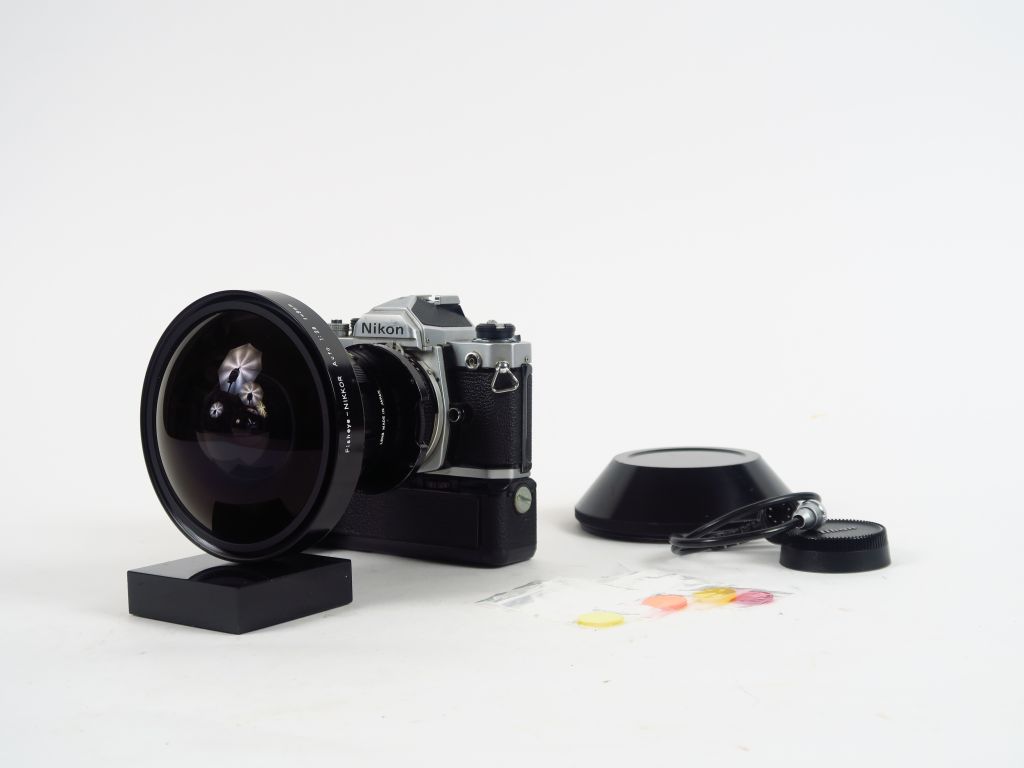 NIKON FM. Numéro 2262717 avec moteur MD-11. Objectif Nikon Nippon Kogaku Fisheye-Nikkor Auto 2,8/8 mm numéro 230422 avec filtres incorporés. Bouchon. Objectif en bel état. Léger choc sur le capot . Câble, filtres, bouchon arrière.