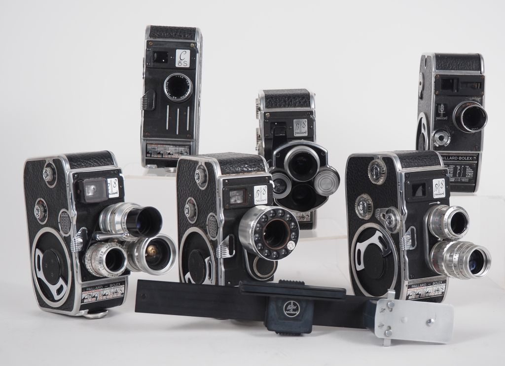 PAILLARD-BOLEX. Lot de six caméras 8mm : - B8 avec objectif SOM BERTHIOT SERVOCINOR 1:1.8/12.5 n°2001243 - C8 - C8S - B8 avec objectif YVAR 1:2.8/36 - L8 - B8