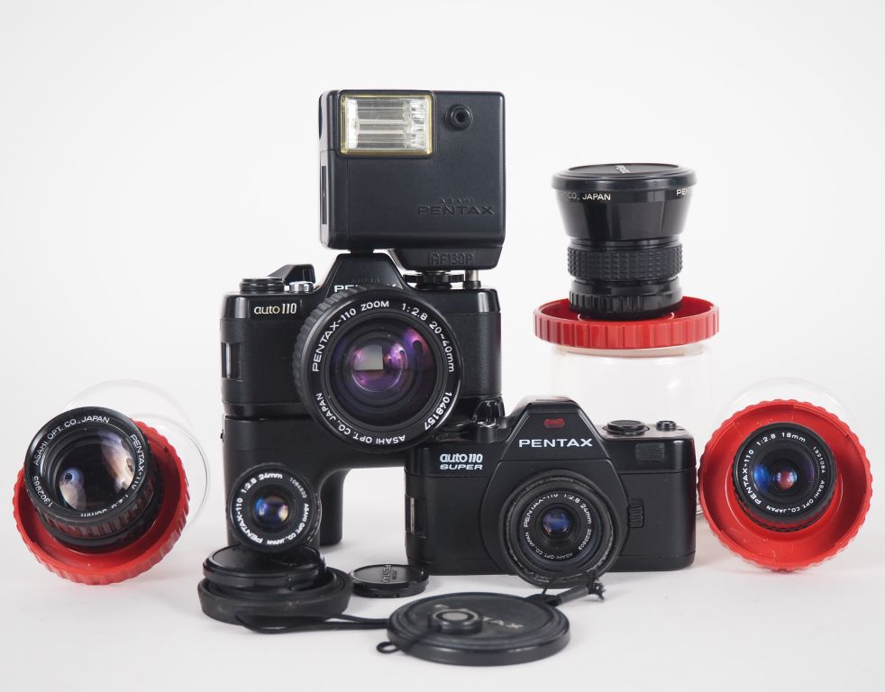 PENTAX. Lot de deux appareils photographiques : - AUTO 110 n°1083623 avec objectif ZOOM 1:2.8/20-40 n°1048157, WINDER II et flash AF130P - AUTO 110 SUPER n°2559714 avec objectif 1:2.8/24 n°25223603 On y joint quatre objectifs PENTAX-110, deux différents pare soleil et un flash AF100 P : - 1:2.8/24 n°1084532 - 1:2.8/50 n°1302965 avec boite - 1:2.8/70 n°1302545 avec boite - 1:2.8/18 n°1901084 avec boite