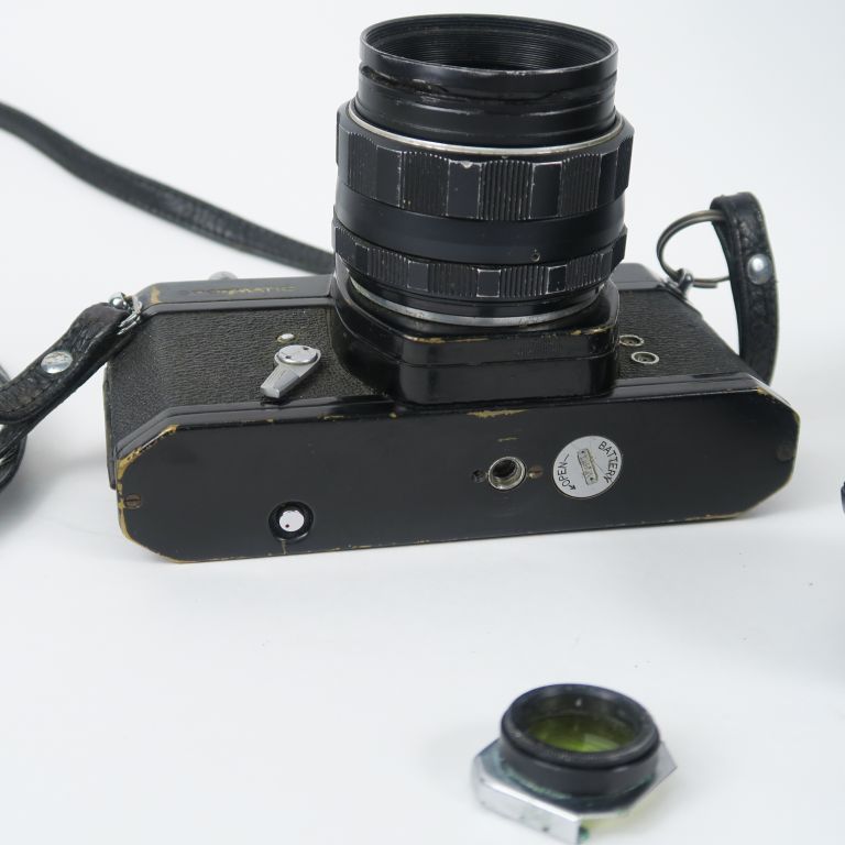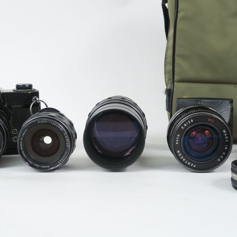 PENTAX SPOTMATIC n°2596208 avec objectif ASAHI Super Takumar 1 :1.4/50 n°2746580. On y joint un objectif PENTACON Auto 2.8/29 + objectif ASAHI Super Takumar 1 :3.5/28 n°4424563 + objectif PENTACON 4/200 n°7055424 + filtres. L’ensemble dans une sacoche de marque AKO.