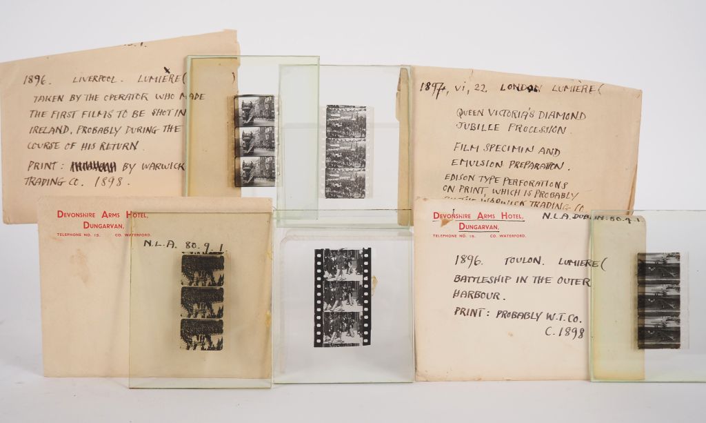 PHOTOGRAPHIE. Lot de six négatifs XIXème sur l'Angleterre, l'Ecosse ou Toulon : - London Lumière : 'Paddle steamer and barge on the river Thames'. Circa 1896. Print : Probably Warwick trading company, circa 1898. - Balmoral Scotland : 'The gatering of the clans'. 1898. Print : Warwick trading company, 1898. - Liverpool Lumière : 'Taken by the operator who made the first films to be shot in Ireland, probably during the course of his return'. 1896. Print : Warwick trading company, circa 1898. - London Lumière : 'Queen's Victoria's diamond jubille procession'. 1897. Film specimen and emulsion preparation. Edison type perforations on print. Probably Warwick trading company, circa 1898. - Toulon Lumière : 'Battleship in the outer harbour'. 1896. Print : Probably Warwick trading company, circa 1898. - Deux négatifs non titrés et non situés
