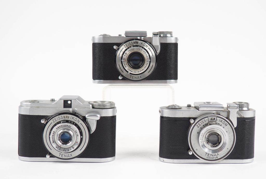 ZEISS IKON TENAX. Lot de trois appareils photographiques : - n°77382 avec objectif NOVONAR 1:3.5/35 - n°H89694 avec objectif NOVONAR 1:3.5/35 - n°49637 avec objectif TESSAR 1:3.5/37.5 n°3218880