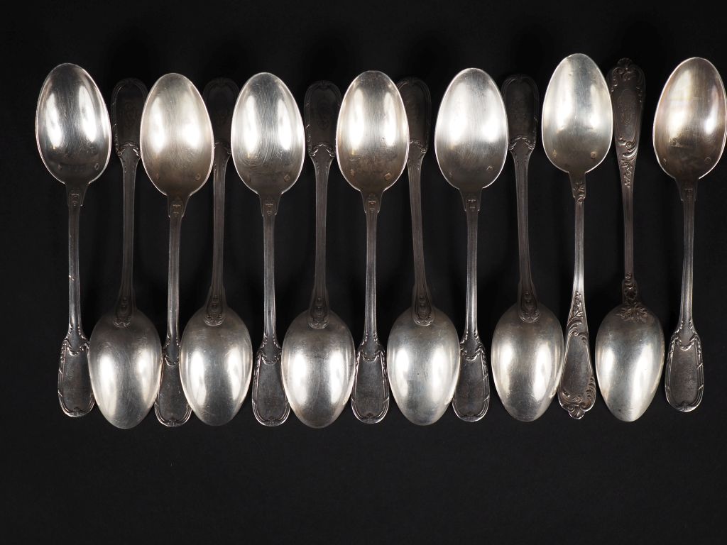 11 cuillères à café en argent de style Louis XVI, poinçon Minerve et deux cuillères à café en argent, poinçon Minerve de style Louis XV Poids total : 324 g