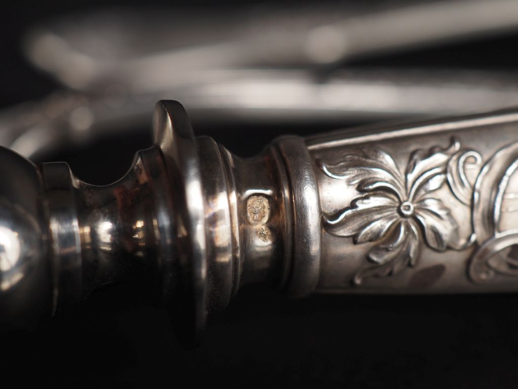 11 grands couverts en argent, poinçon Minerve de style Rocaille à décor de coquille et de guis Poids : 1849 g 12 petites cuillères en argent, assorties Poids : 280 g On y joint 12 grands couteaux manche argent fourré et un manche à gigot en argent fourré (modèle dépareillé)