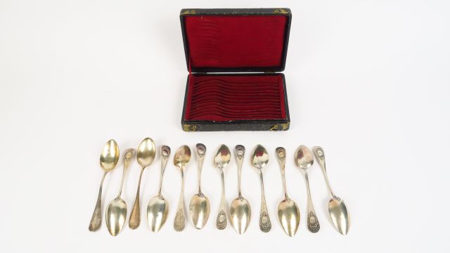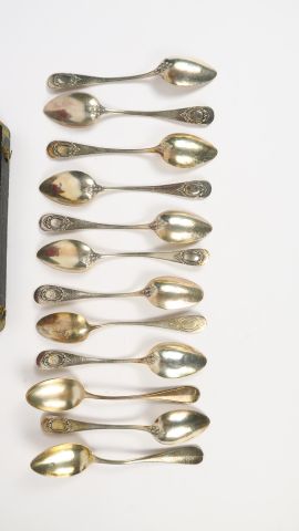 12 cuillères à café en argent, poinçon Minerve monogrammées dans leur coffret. 252 g