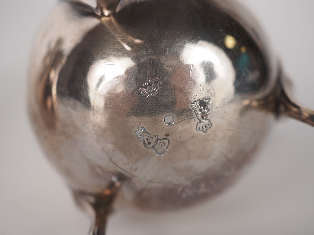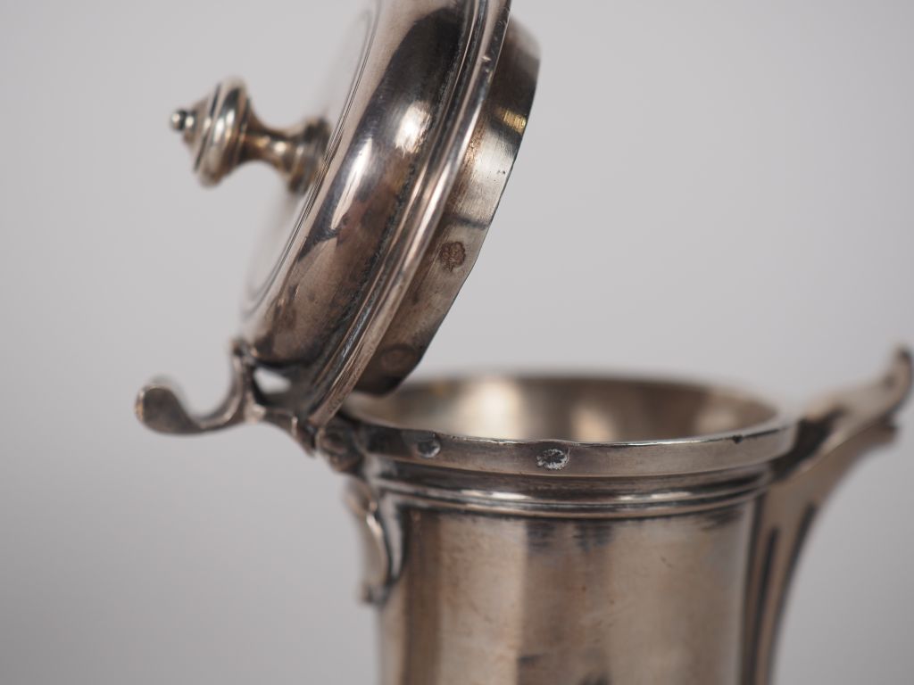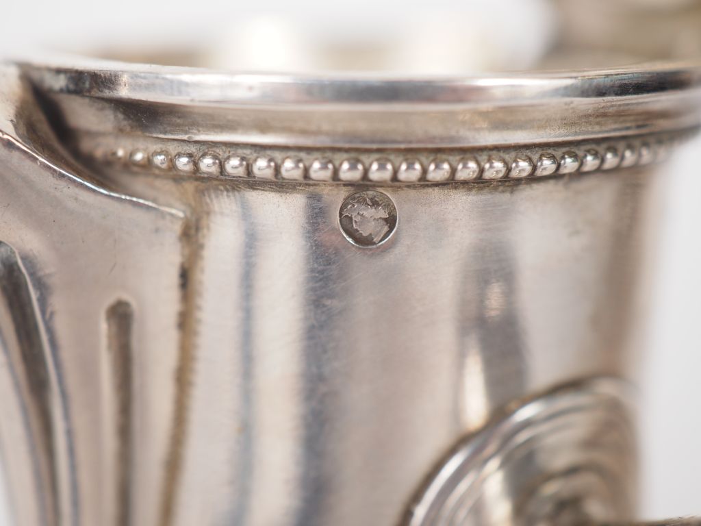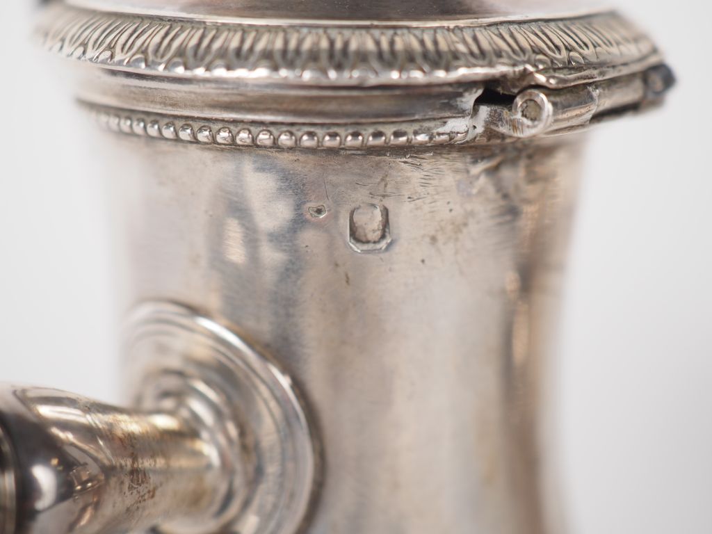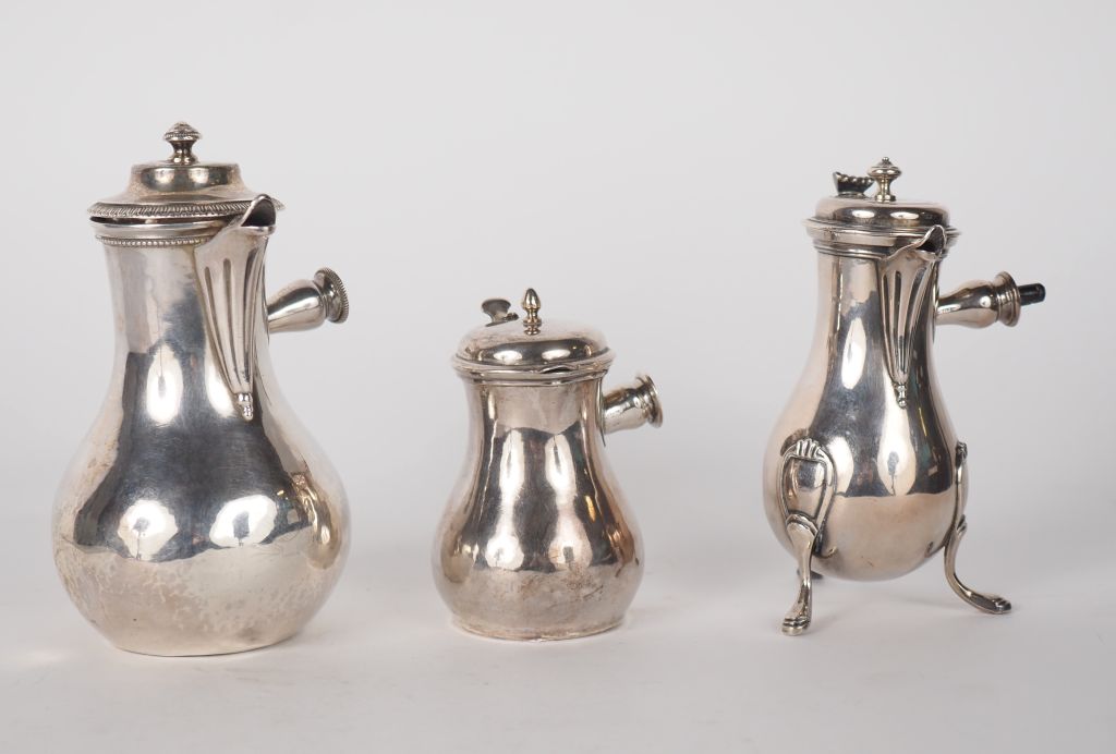 2 différentes verseuses égoïstes en argent, une poinçon XVIIIème. Paris, Maître Orfèvre : CJF , l'autre poinçonnée au premier coq (enfoncement) On y joint une verseuse tripode en argent XVIIIème, Paris Poids total des trois verseuses : 409 g (manque les manches)