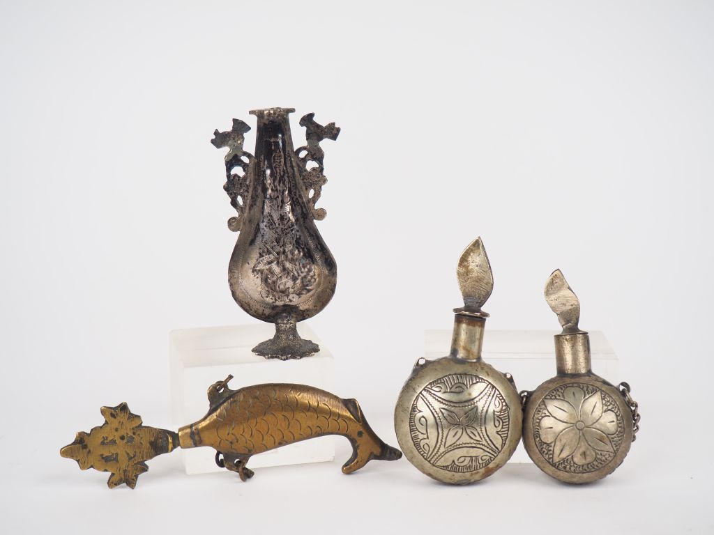 4 flacons à odeur Afrique du Nord en métal argenté ou argent bas-titre et bronze à décor de fleurs et de rinceaux. Poids tel. 107 g.