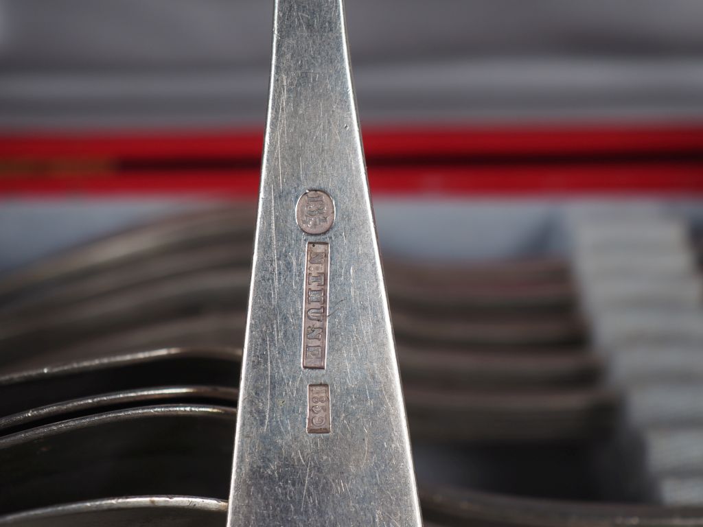 5 couverts et une fourchette en argent, modèle à filet, travail étranger MO : Thune 1859 Poids : 800 g