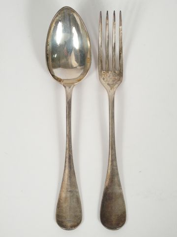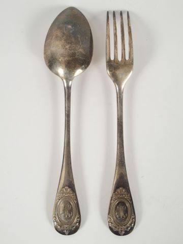 6 grands couverts de style Louis XVI en argent, poinçon Minerve, monogrammés. M.O : JG. Poids : 953 gr