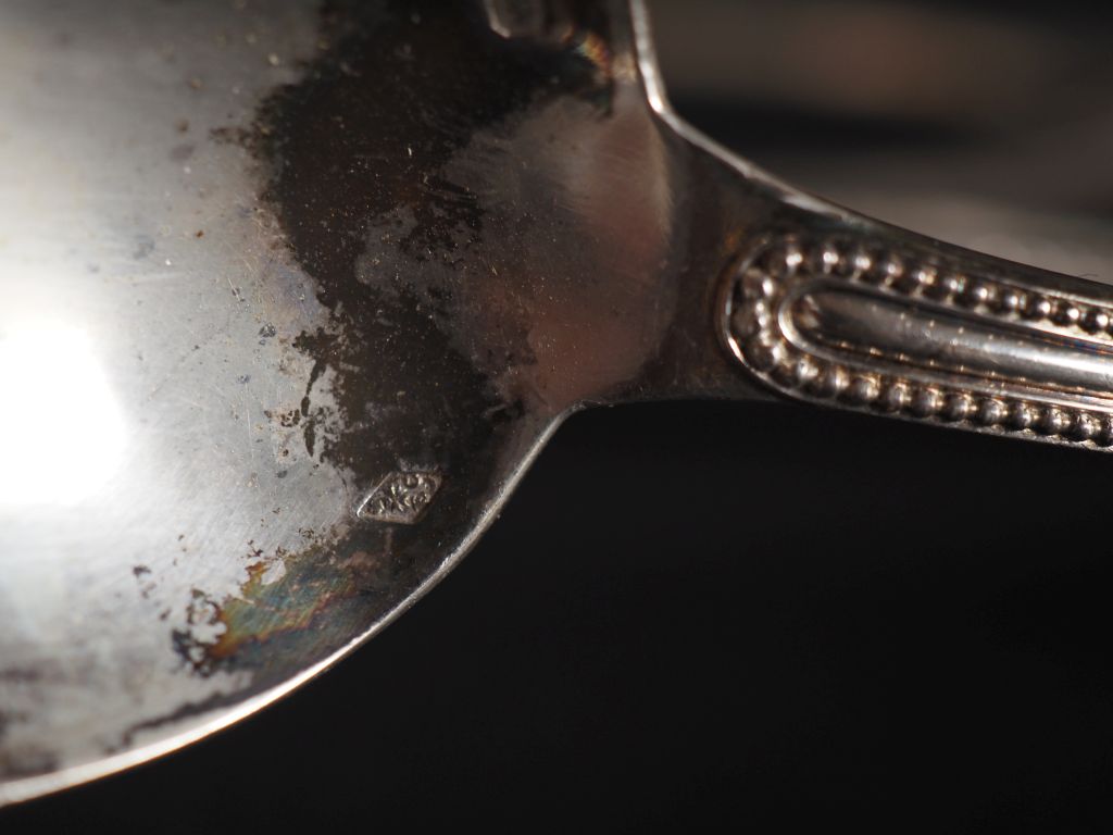 6 grands couverts et 6 couverts à entremets et une louche en argent, poinçon Minerve, modèle à perles Poids : 2000 g