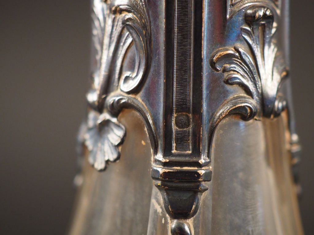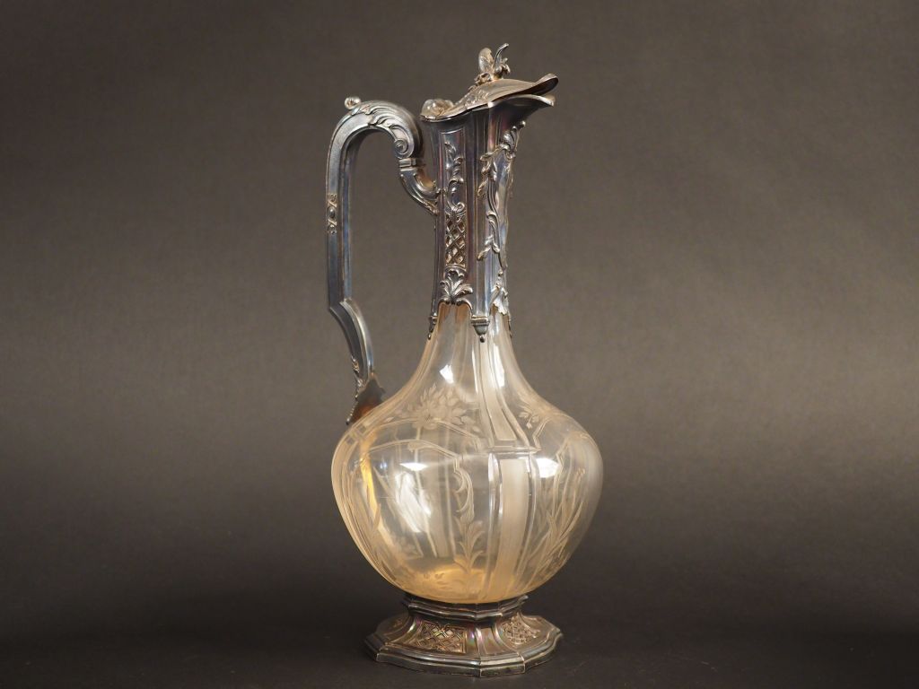 Aiguière de style Louis XV en cristal et argent, poinçon Minerve, à décor de rinceaux, cartouche feuillagé et de treilles. H. 31 cm Poids tel. 1190 g