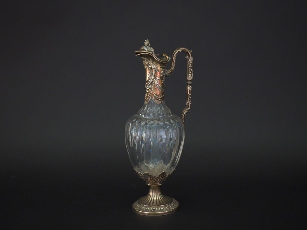 Aiguière de style Louis XVI en cristal et argent, poinçon Minerve, à décor de cartouche, nœud de ruban, frise de feuilles d'acanthe et rinceaux feuillagés. Pied cannelé. Anse feuillagée. Prise e forme de bouquet de fleurs. M.O : Ed. T H. 30 cm Poids tel. 1032 g