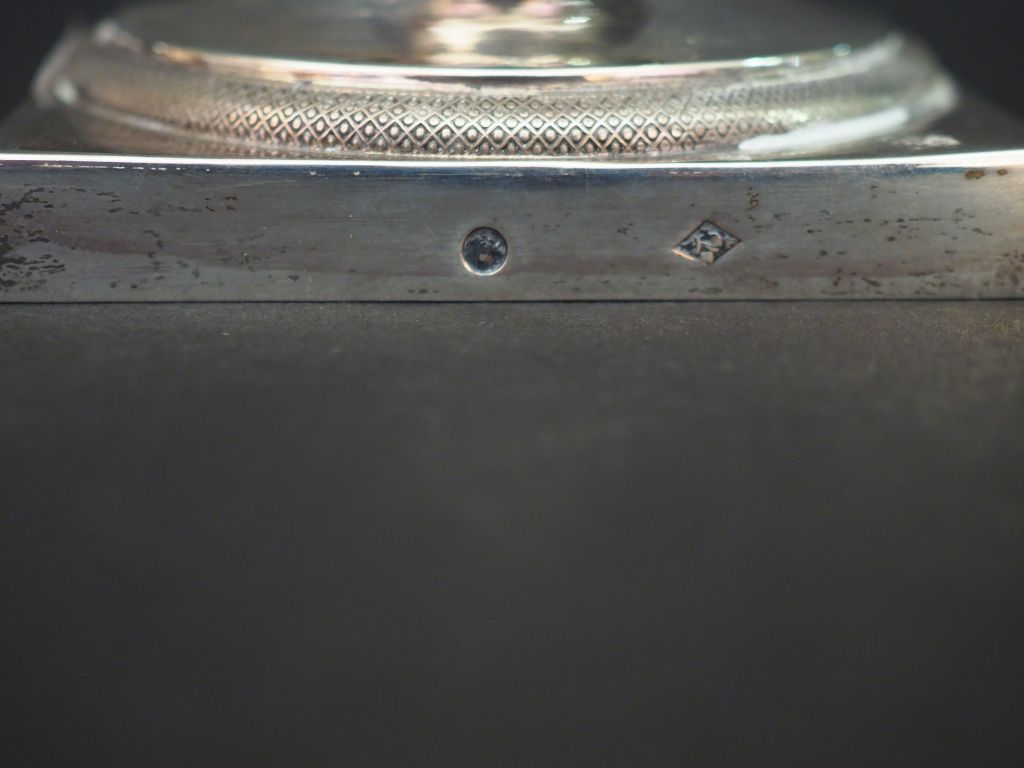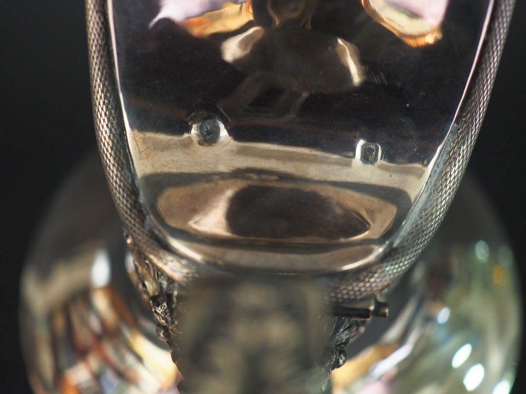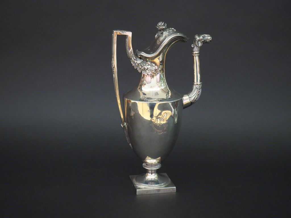 Aiguière Restauration de style Empire en argent, poinçon Vieillard, à décor de feuilles de chêne et de gland. Bec verseur à tête de bélier, prise du couvercle en forme de fleur. Monogrammée. H. 34 cm Poids : 928 g (petits enfoncements)
