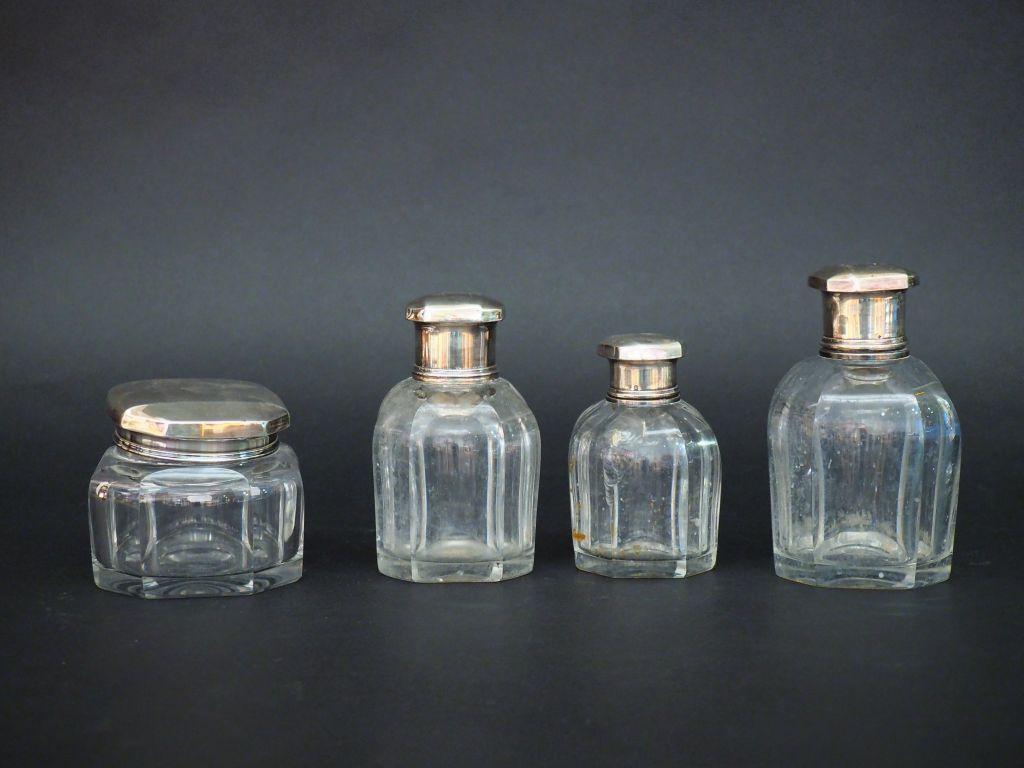 BACCARAT. Garniture de toilette en cristal et argent, poinçon Minerve. Comprenant : - trois flacons - un pot à fard Poids des couvercles : 139 g (un flacon accidenté)