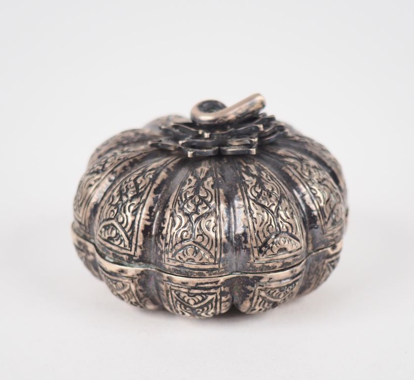 Boîte à pilules extrême-orient en métal argenté ou argent bas-titre formant une citrouille. Poids. 26 cm.
