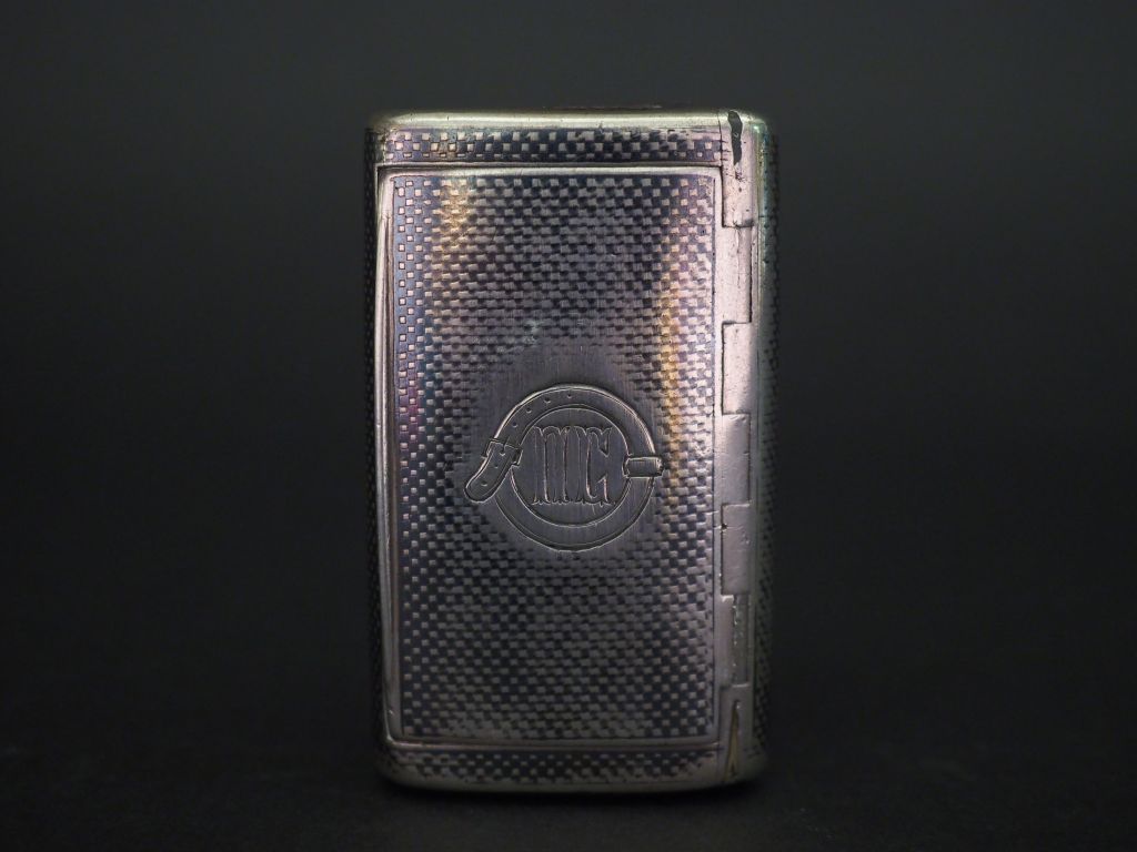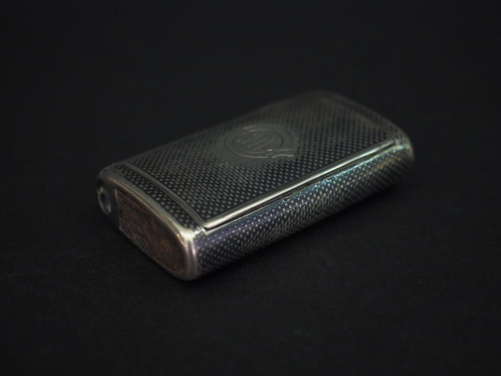 Boite à pilules rectangulaire en argent, à décor niellé de cubes et de monogramme dans un cartouche. 1,5 x 6,6 x 4 cm Poids. 71 g