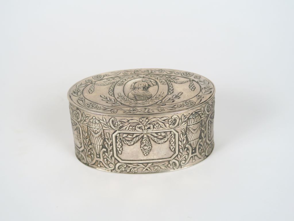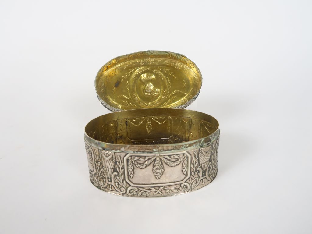 Boite ovale de style Louis XVI en argent étranger et vermeil. Poids. 150 gr
