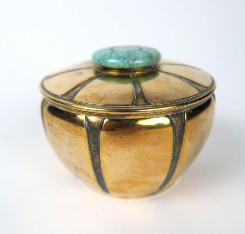 BOUCHERON. Sucrier en vermeil, poinçon Minerve, à décor de cotes. Belle prise en pierre verte. Signé. Poids tel : 311 g