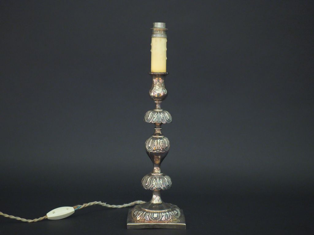 Bougeoir en argent étranger, à décor de feuillage et godrons. Monté à l'électricité. H. du fût : 29 cm Poids tel. 392 g (environ)