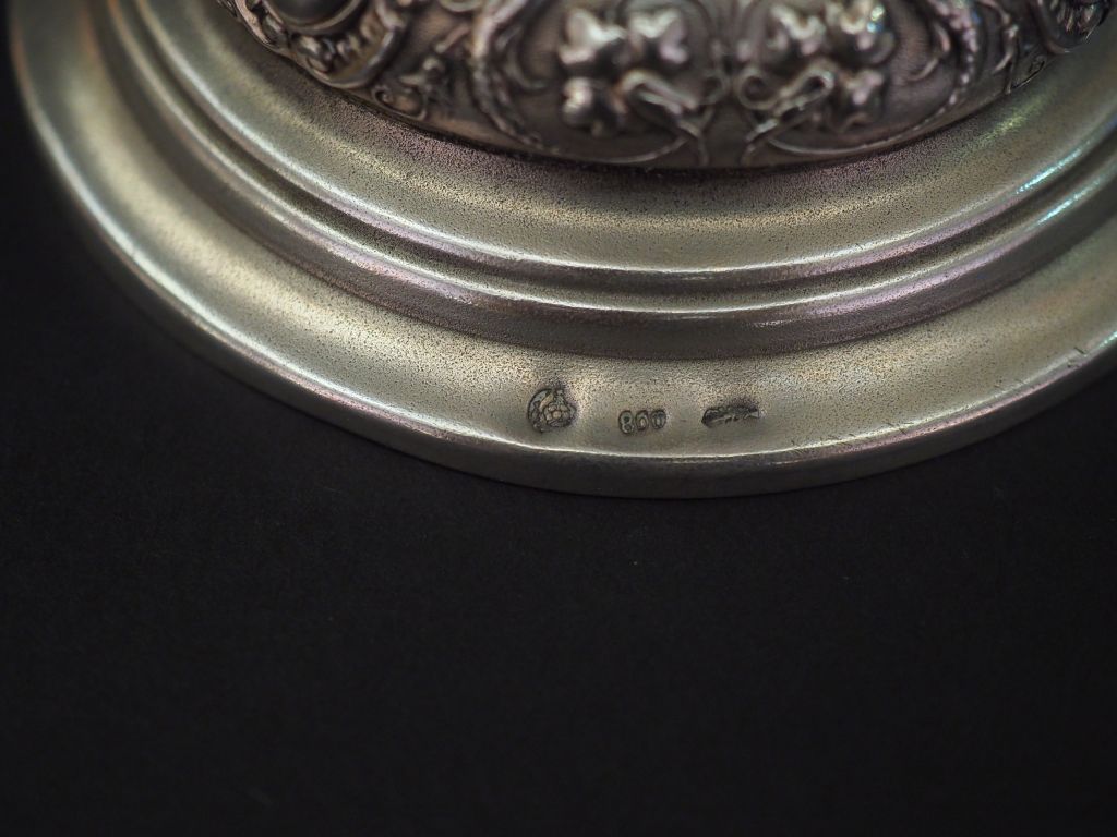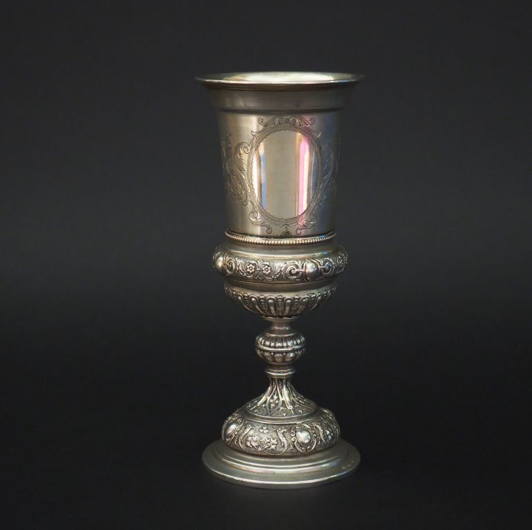 Calice de style Louis XV en argent 800 et vermeil, à décor de cartouches, godrons, rinceaux et branchages fleuris. H. 21,2 cm Poids. 207 g