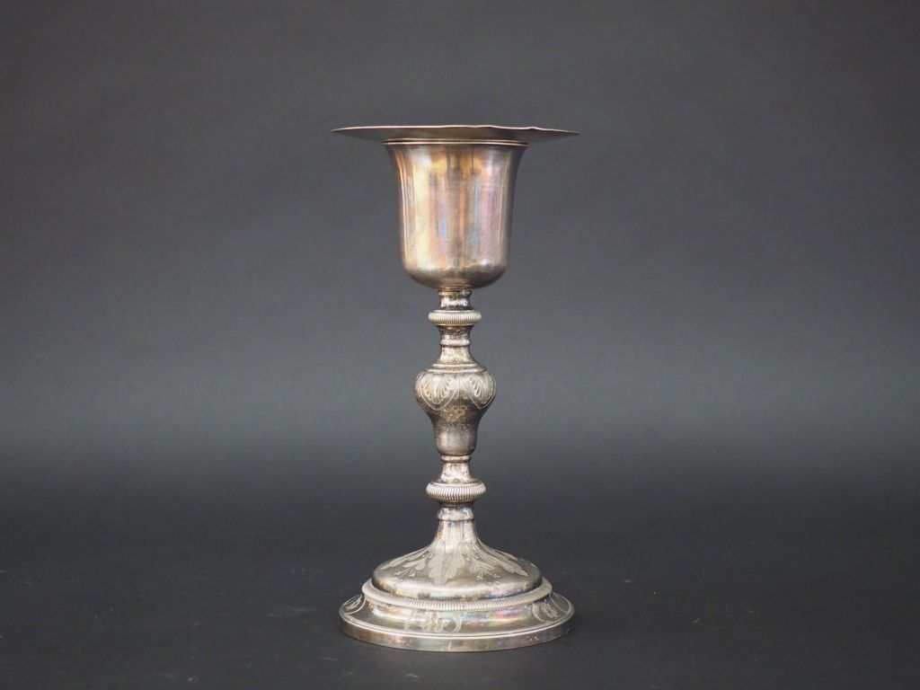 Calice et patène en argent, poinçon Minerve, et métal argenté, à décor de fleurs et de feuillage. H. 27 cm Poids tel. 607 g Poids de la coupe et de la patène : 137 g (petits enfoncements à la patène, fût et base en métal argenté)